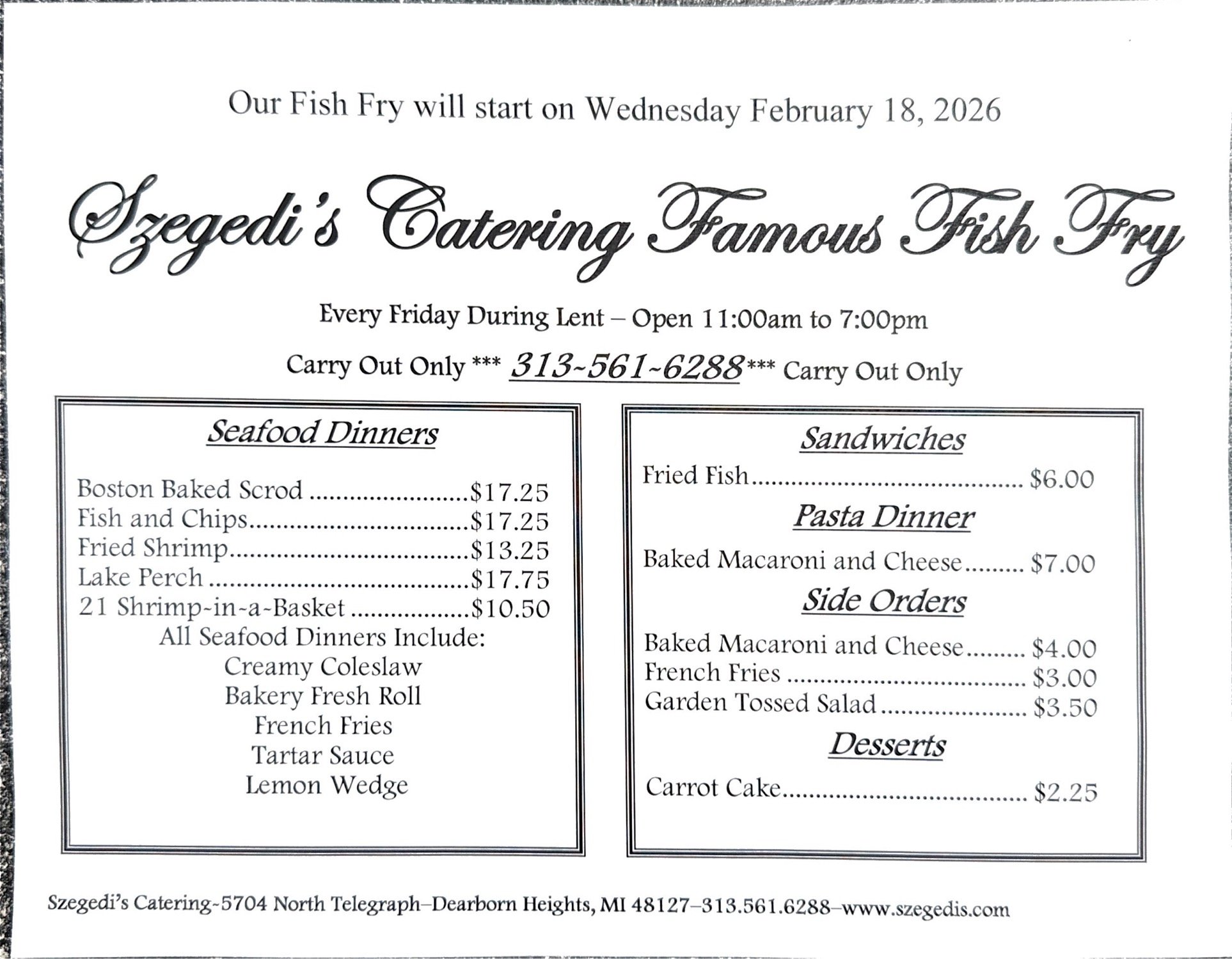 Szegedi’s provides services ranging from twelve to 5,000 guests. Navigate through this website to determine your needs for your event. We can provide anything from a full serviced catered event to individual items from our ala carte menu. Please consider us for your upcoming event, if you have any questions, call 313-561-6288 to speak to one of our party consultants.