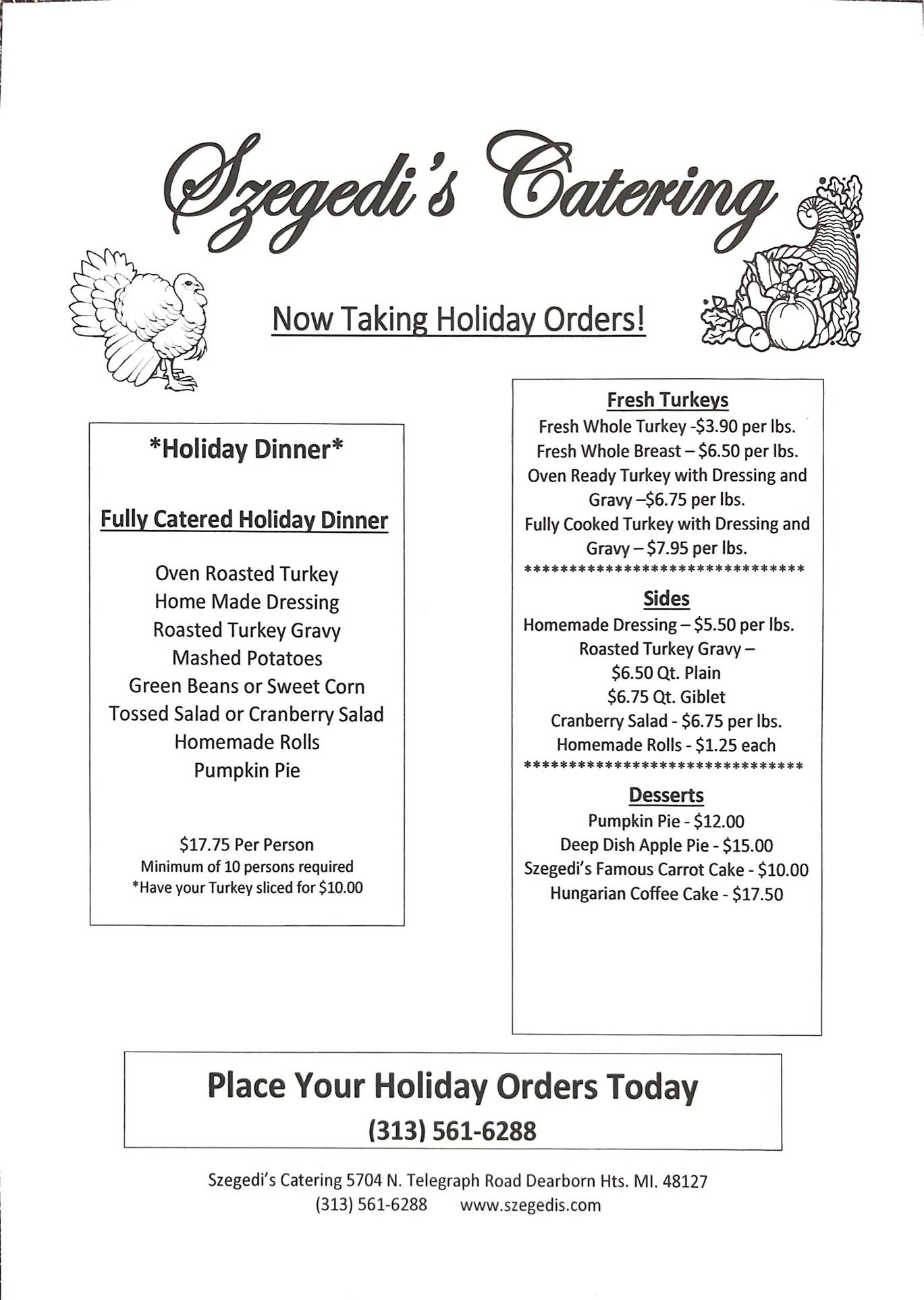 Szegedi’s provides services ranging from twelve to 5,000 guests. Navigate through this website to determine your needs for your event. We can provide anything from a full serviced catered event to individual items from our ala carte menu. Please consider us for your upcoming event, if you have any questions, call 313-561-6288 to speak to one of our party consultants.